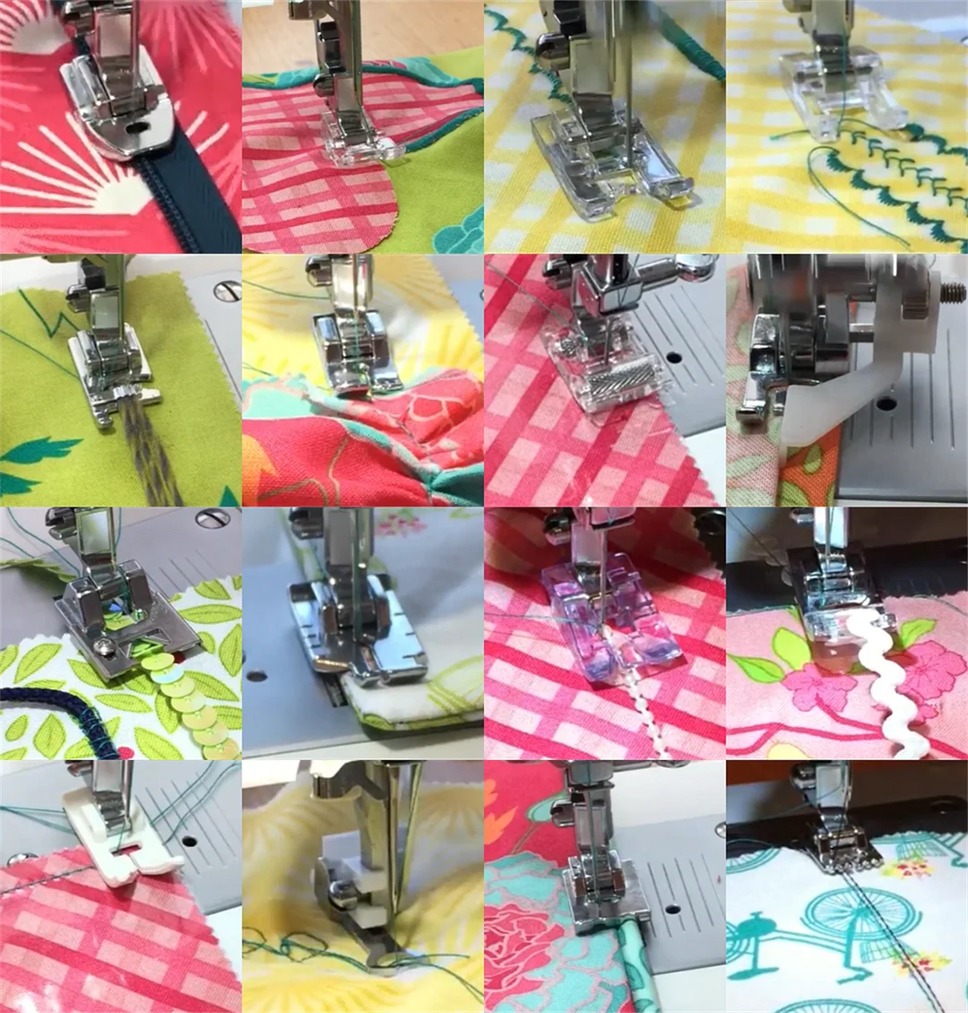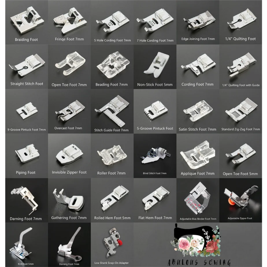 - Full list of presser feet: Invisible Zipper Foot, Applique Foot 7mm, Satin Stitch Foot 7mm, Open Toe Foot 7mm, Cording Foot 7mm, Straight Stitch Foot, Roller Foot 7mm, Blind Stitch Foot 7mm, Braiding Foot,1/4" Quilting Foot, Beading Foot 7mm, Standard Zig-Zag Foot 7mm, Non-Stick Foot 5mm, Darning Foot 7mm, Piping Foot,9-Groove Pintuck Foot 7mm,1/4" Quilting Foot with Guide, Gathering Foot 7mm, Knit Foot 5mm, Adjustable Zipper Foot, Fringe Foot 7mm,5-Groove Pintuck Foot, Darning Foot 7mm, Stitch Guide Foot 7mm,5 Hole Cording Foot 7mm,7 Hole Cording Foot 7mm, Edge Joining Foot 7mm, Overcast Foot 7mm, Open Toe Foot 5mm, Rolled Hem Foot 5mm, Flat Hem Foot 7mm, Adjustable Bias Binder Foot 7mm, Low Shank Snap-On Adapter.