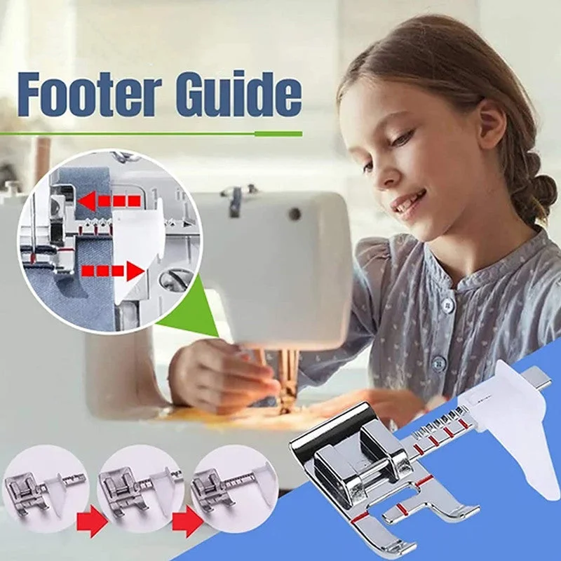 - The presser foot has a "ruler" with a guide designed so you can place the guide anywhere you want.
