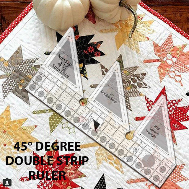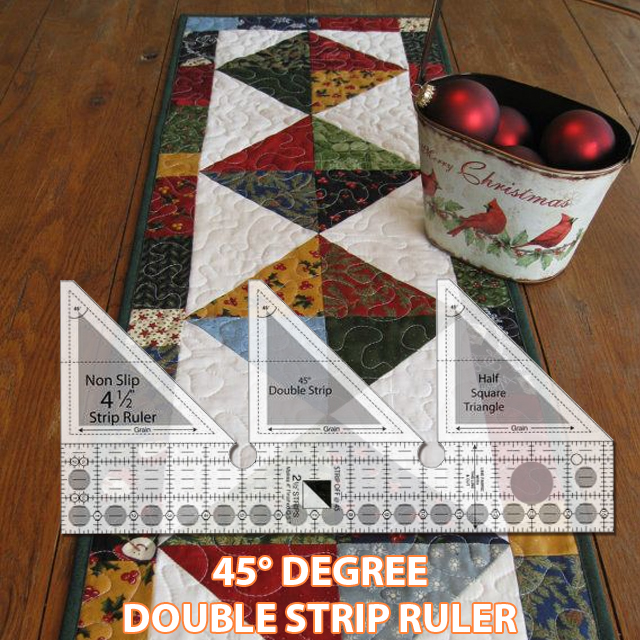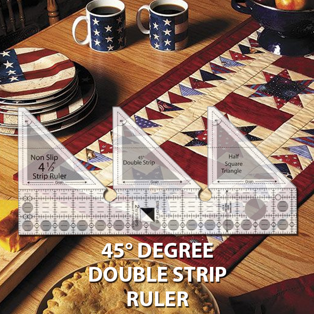 The 45° Double-Strip ruler is one of a range of Strip Rulers that are designed to make cutting Half-Square-Triangles, Quarter-Square-Triangles, 60° Triangles, Trapezoids and more from 2½" wide strips quickly and easily!