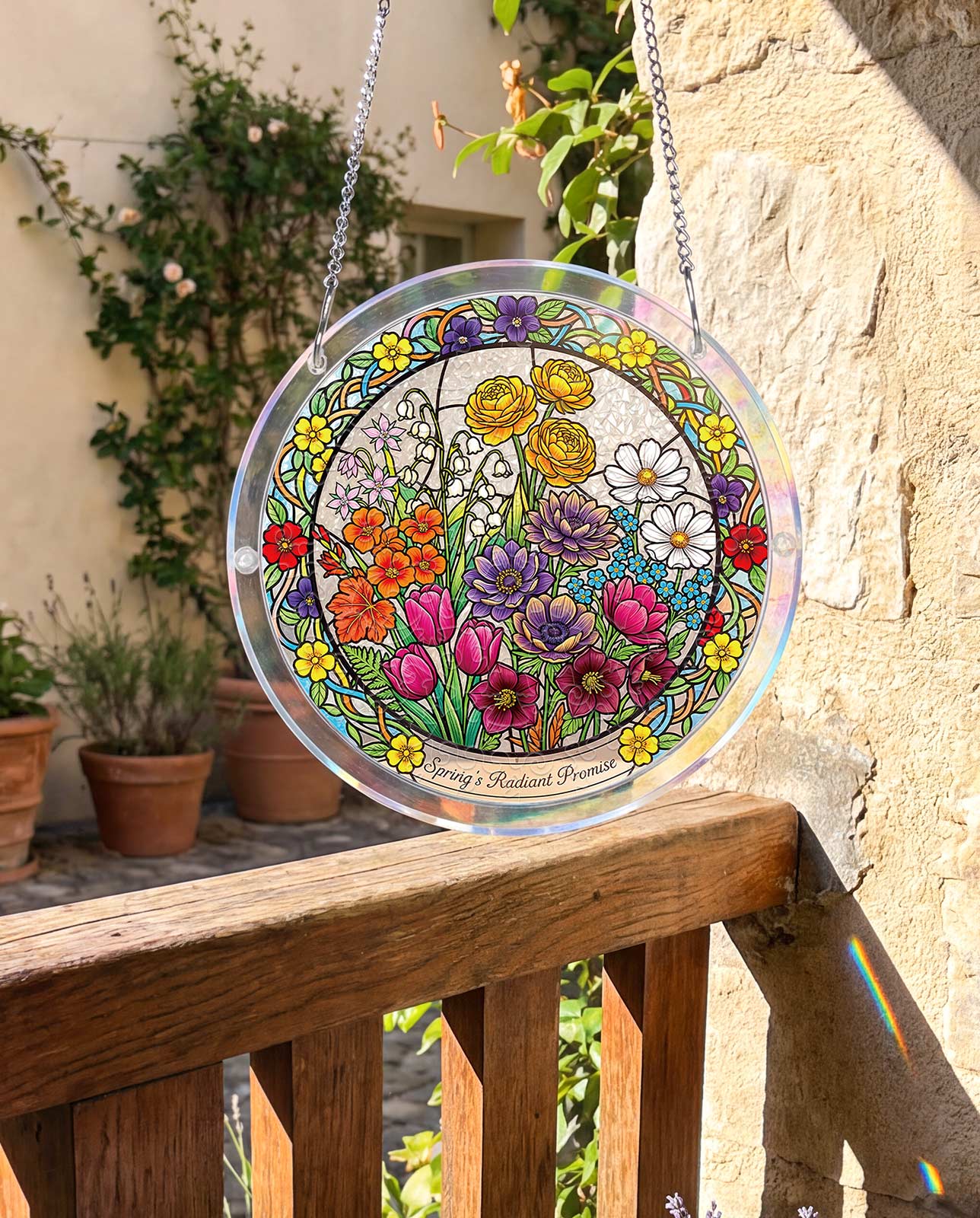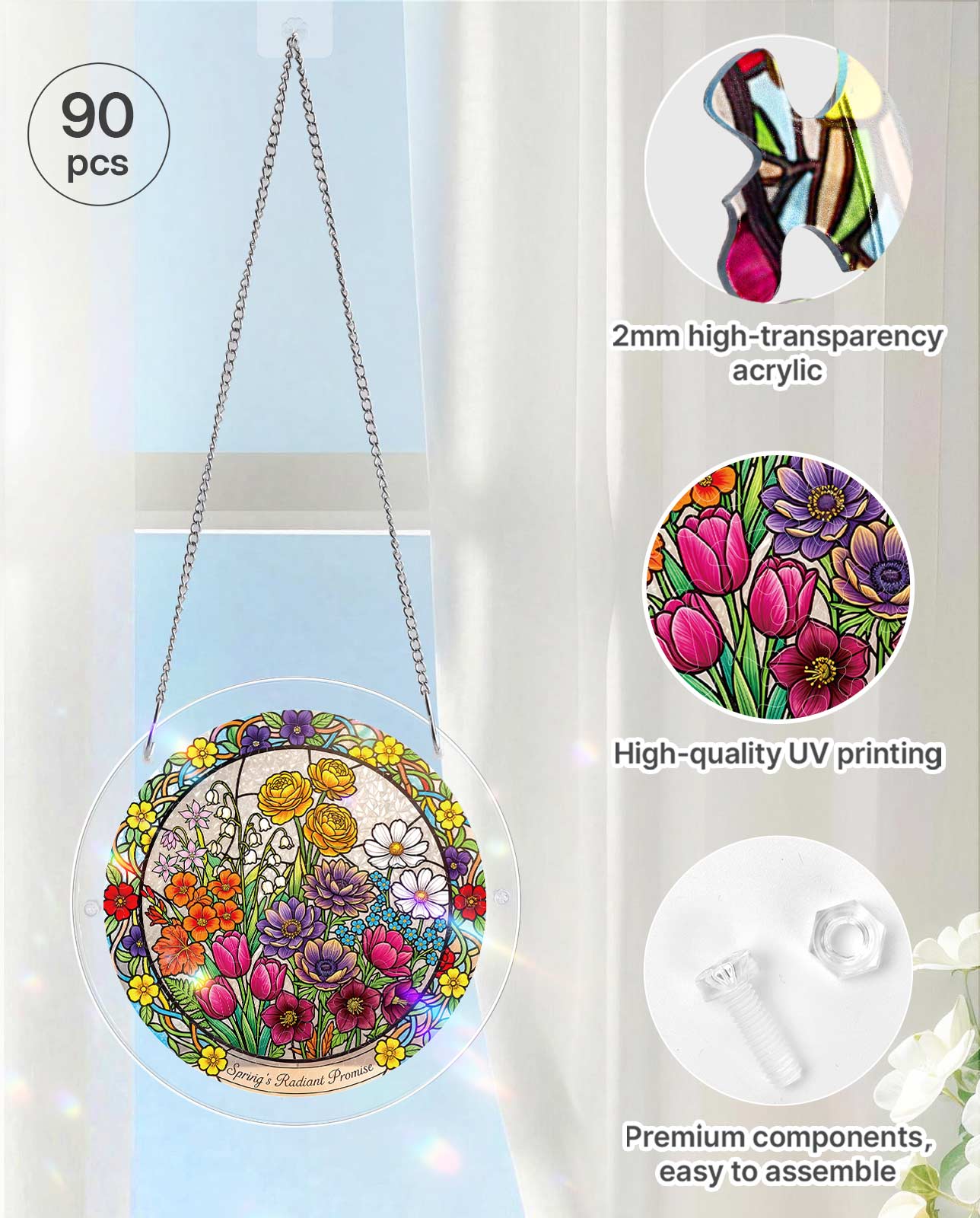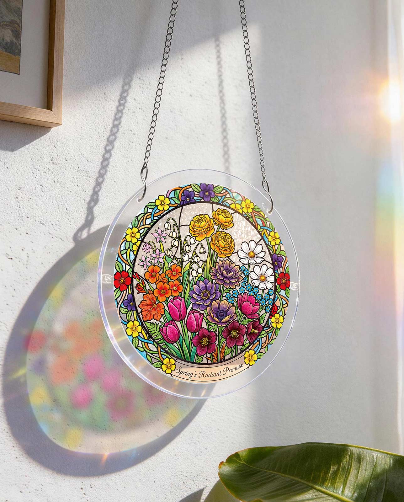 This spring scene features a variety of colorful flowers, including tulips and daisies, in a stunning stained-glass style that transforms into a dazzling suncatcher.