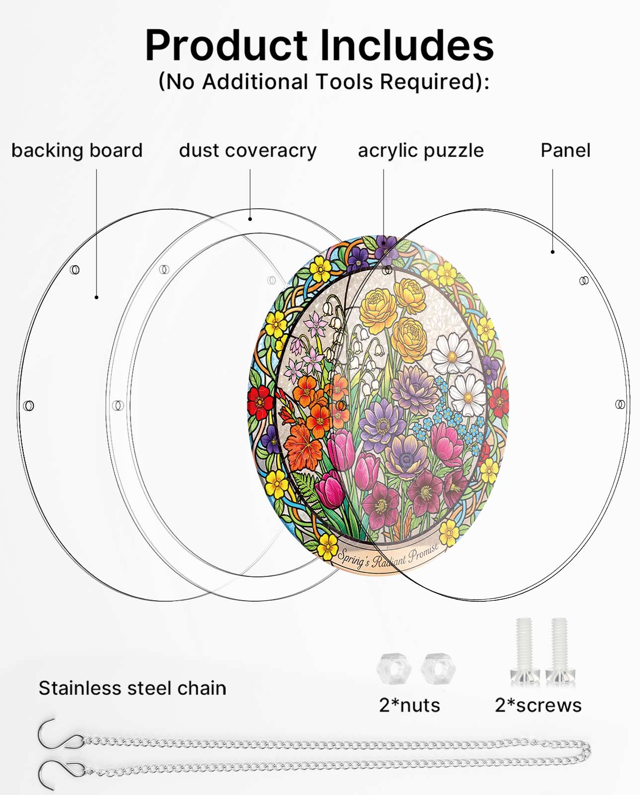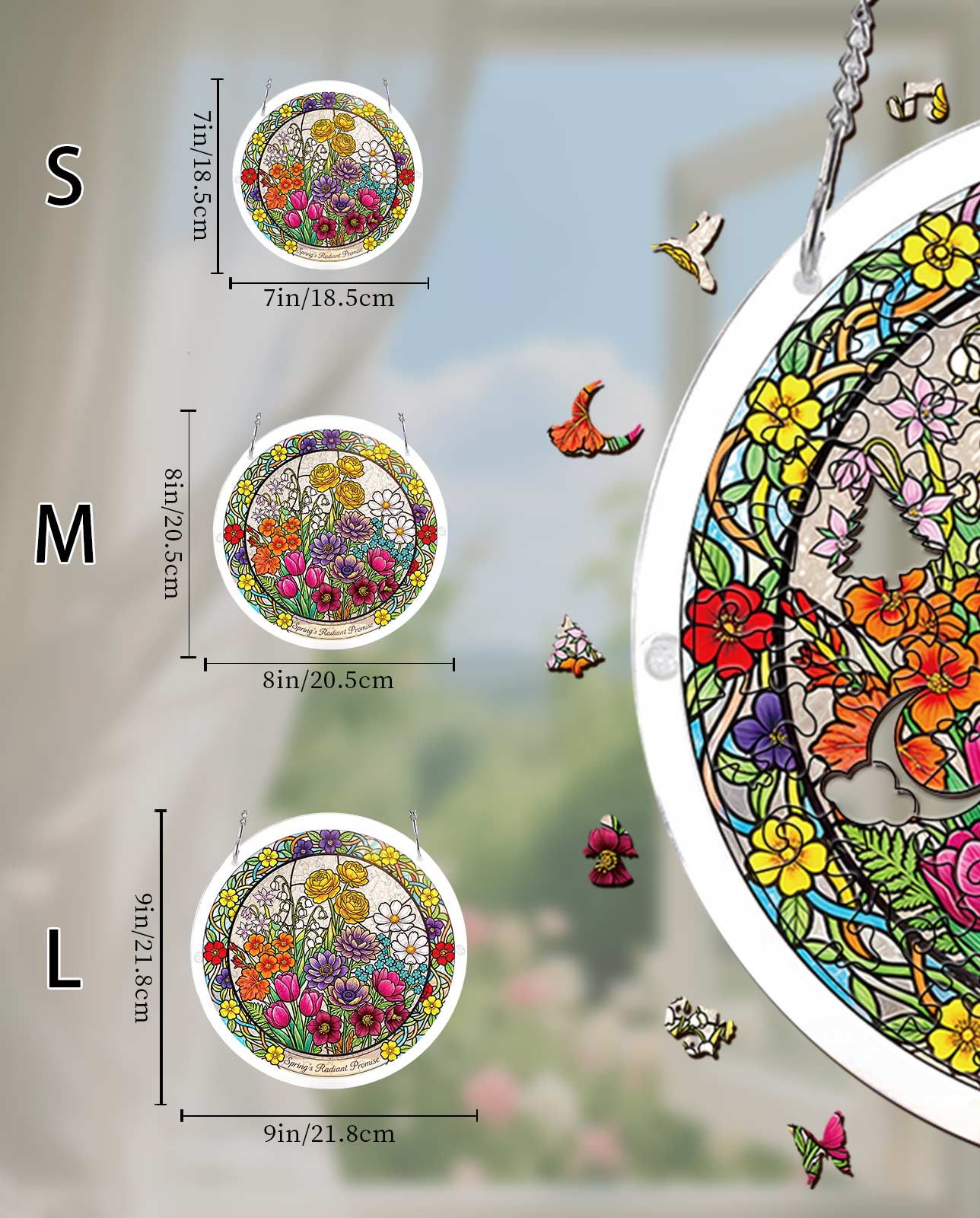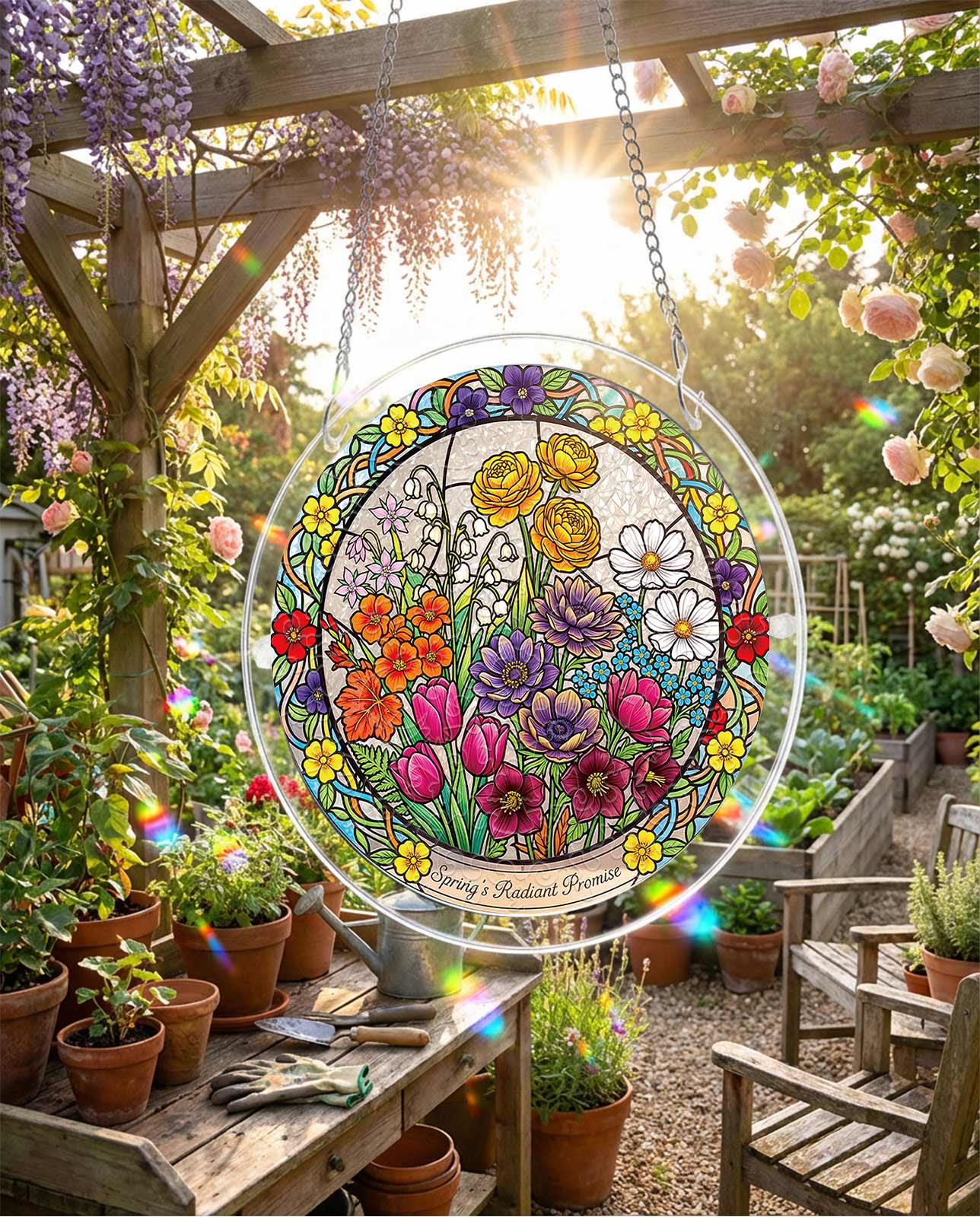 This spring scene features a variety of colorful flowers, including tulips and daisies, in a stunning stained-glass style that transforms into a dazzling suncatcher.