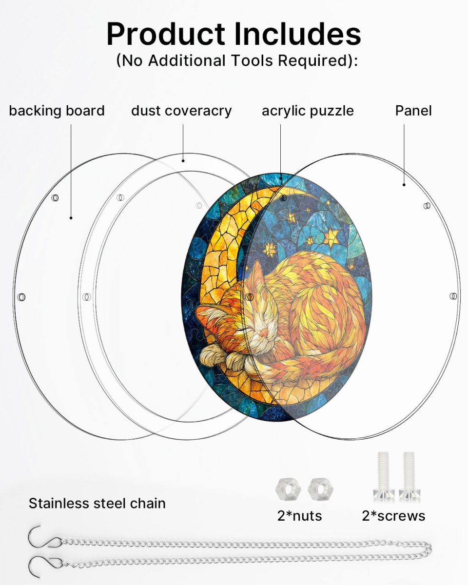 Bring a touch of celestial warmth to your home with the Cozy Moonlit Cat Acrylic Puzzle. This enchanting design features a sleeping ginger cat curled up on a glowing crescent moon, set against a deep blue, starry night sky. The vibrant stained-glass style captures the cozy magic of a peaceful night.