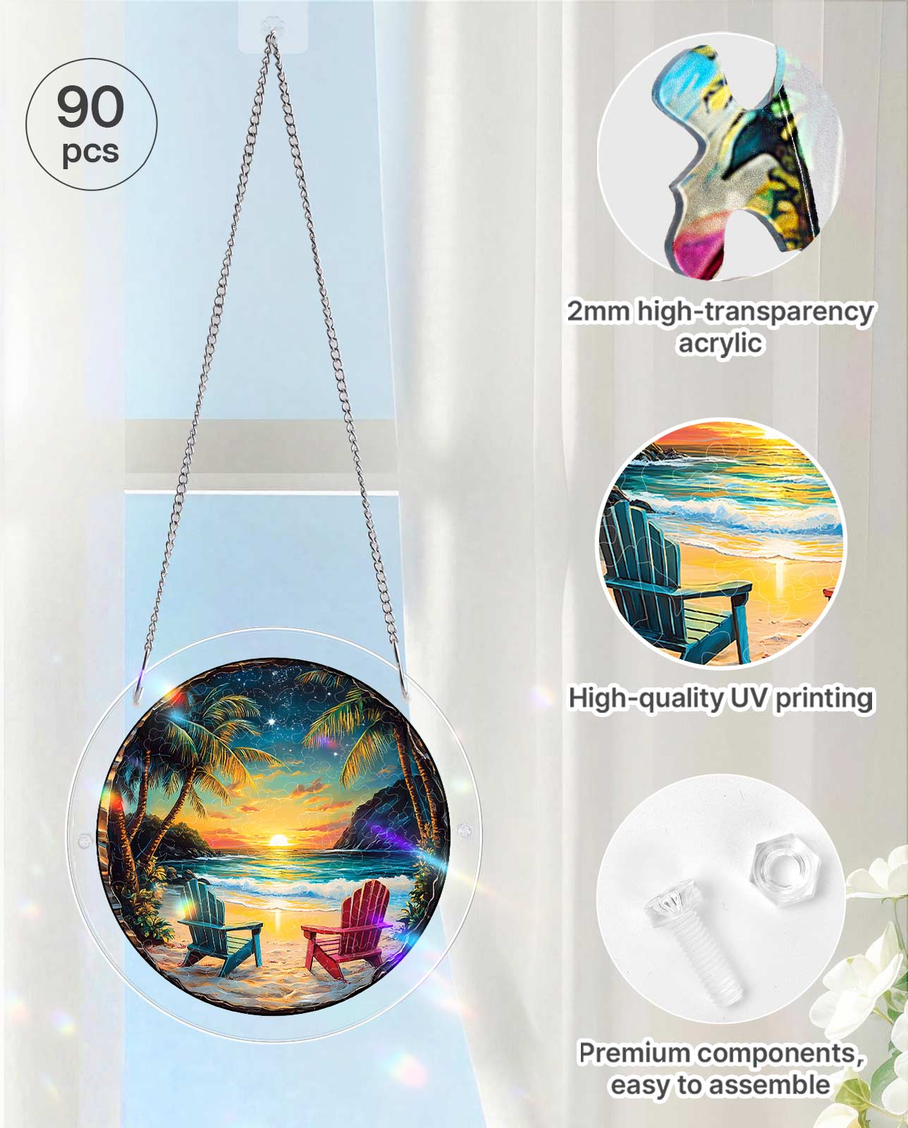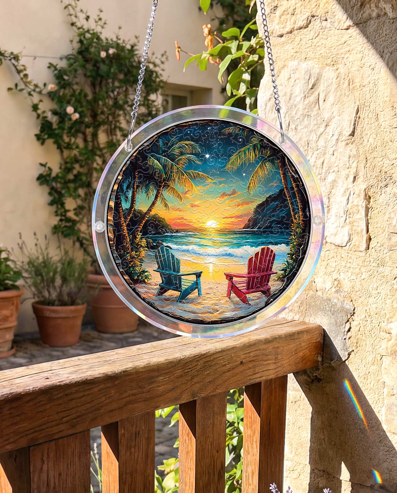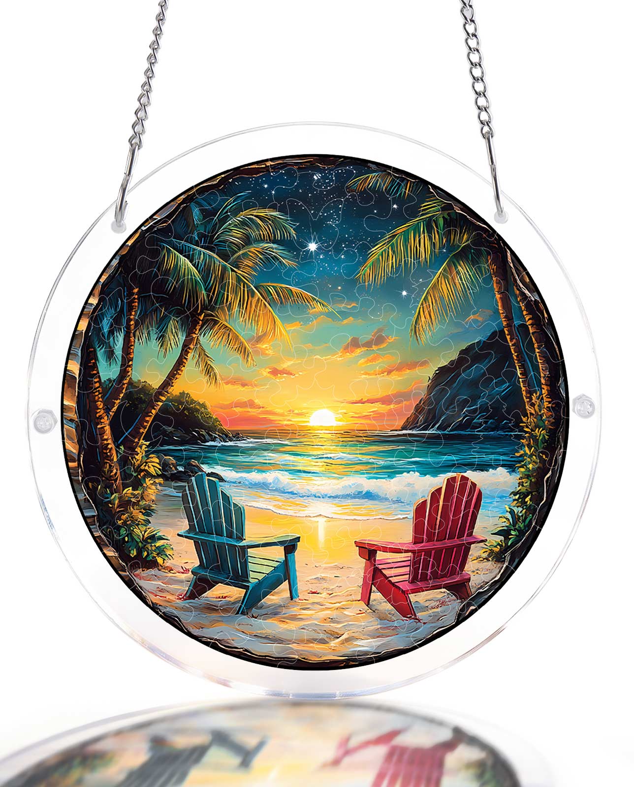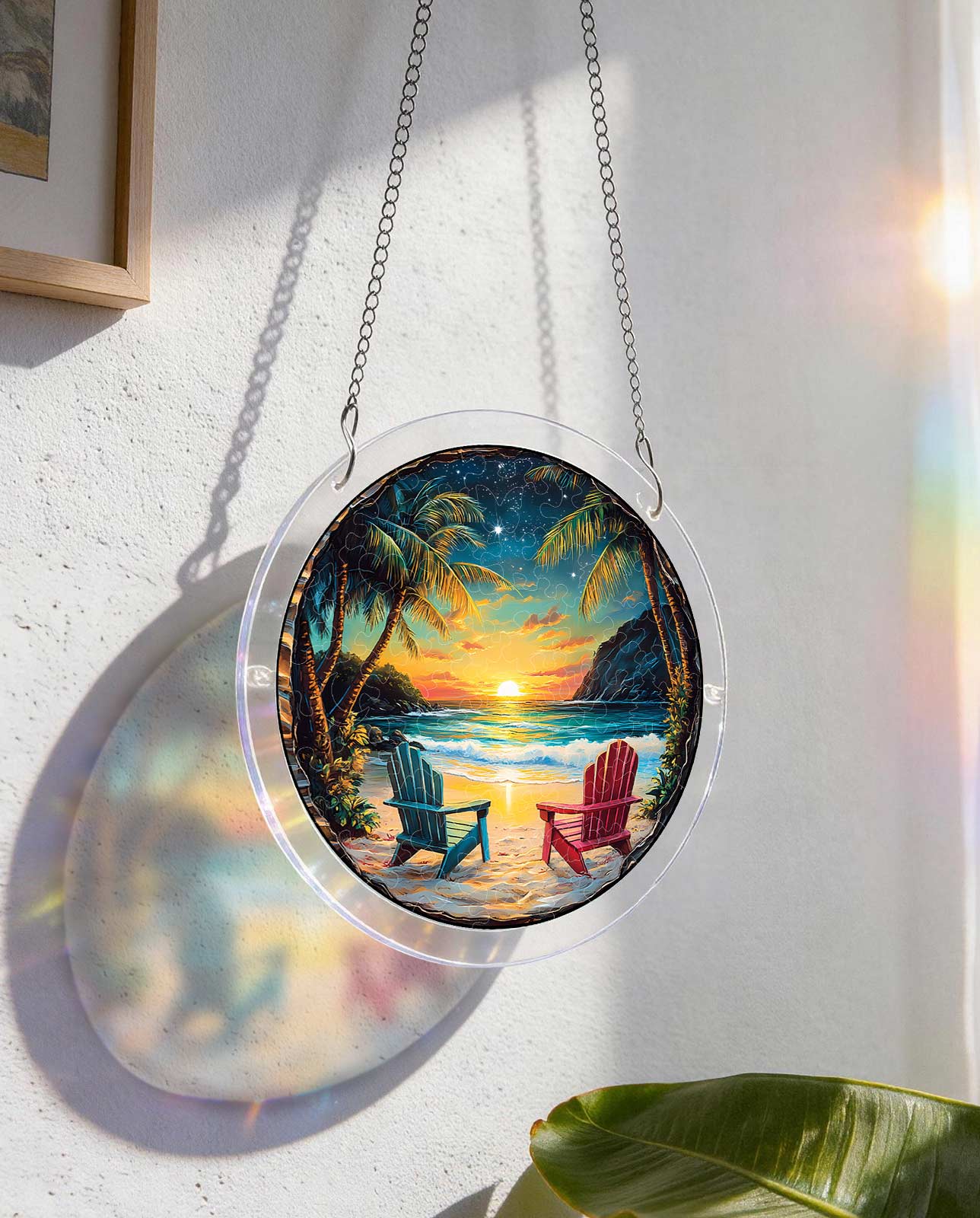 This sunset scene features swaying palm trees, colorful beach chairs, and a vibrant stained-glass aesthetic that transforms into a dazzling suncatcher.