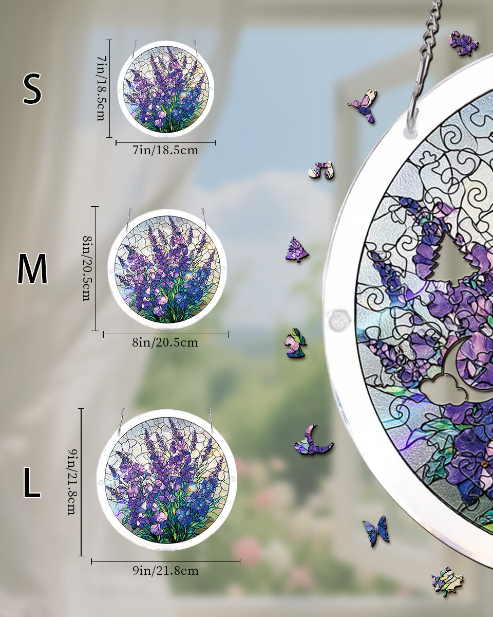Bring the serene beauty of a flower garden indoors with the Blooming Lavender Acrylic Puzzle. This exquisite design features a lush bouquet of purple and blue wildflowers, rendered in a classic stained-glass style that highlights every delicate petal and leaf.