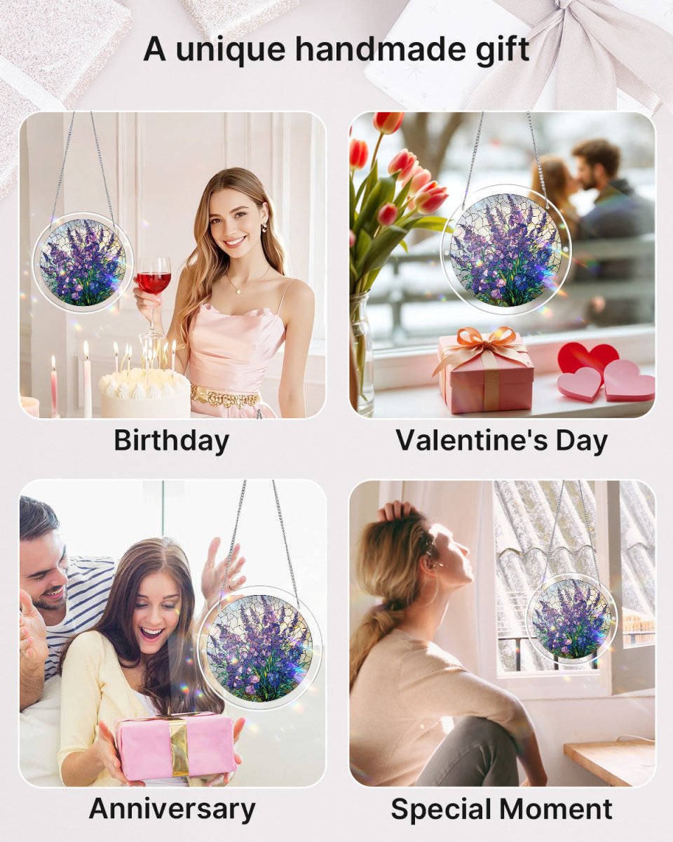 Crafted from premium acrylic, this unique puzzle transforms into a radiant suncatcher. When placed in a window, it captures natural light to create a stunning display of violet and blue hues, adding a touch of floral elegance to your home décor. Perfect for flower lovers and puzzle enthusiasts alike.