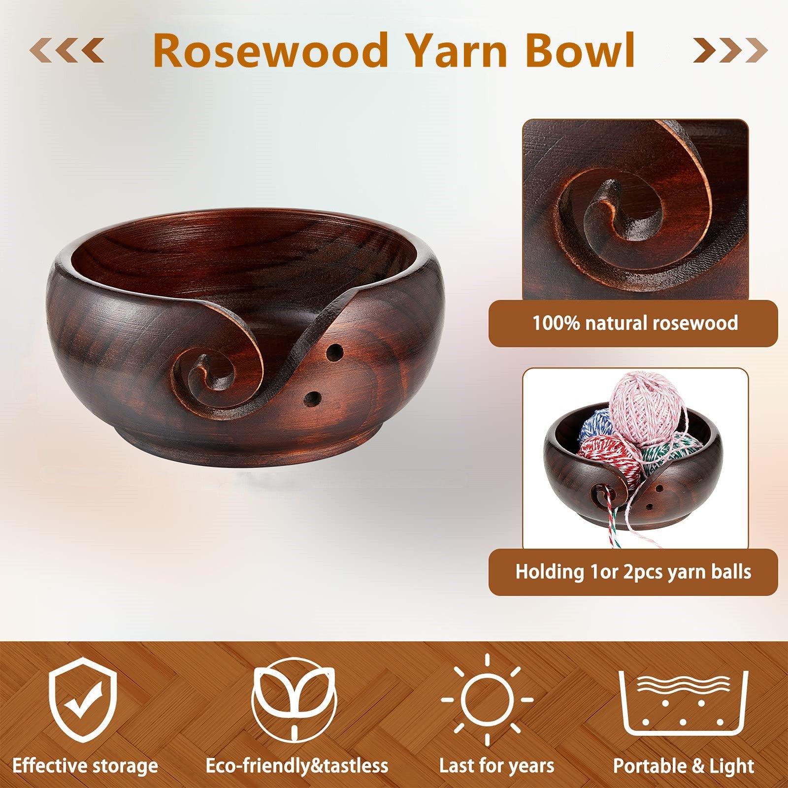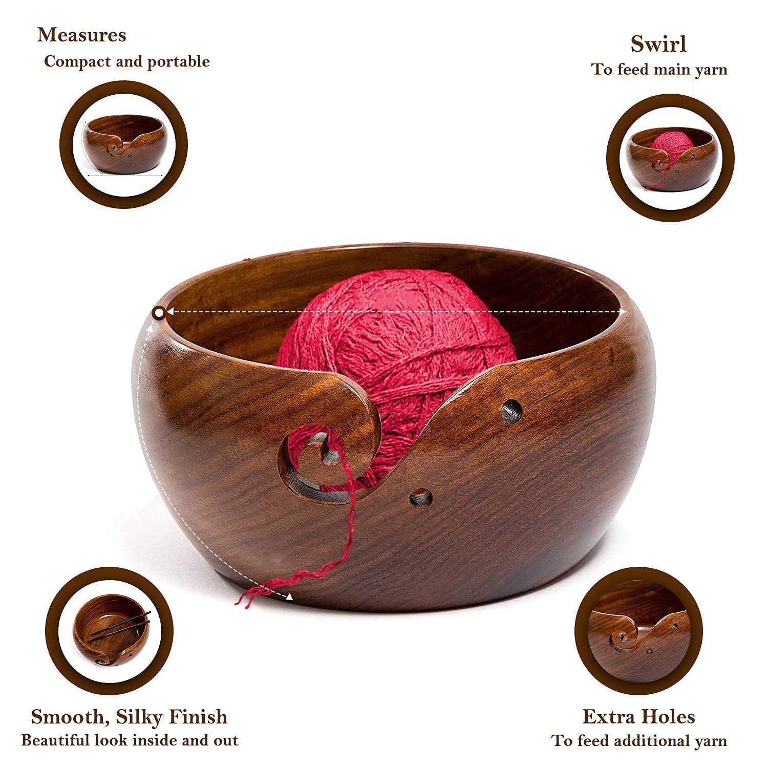 Our yarn bowl is made of rosewood with top craftsmen handmade. The inside and outside of the bowl are smooth, will not damage your yarn.
