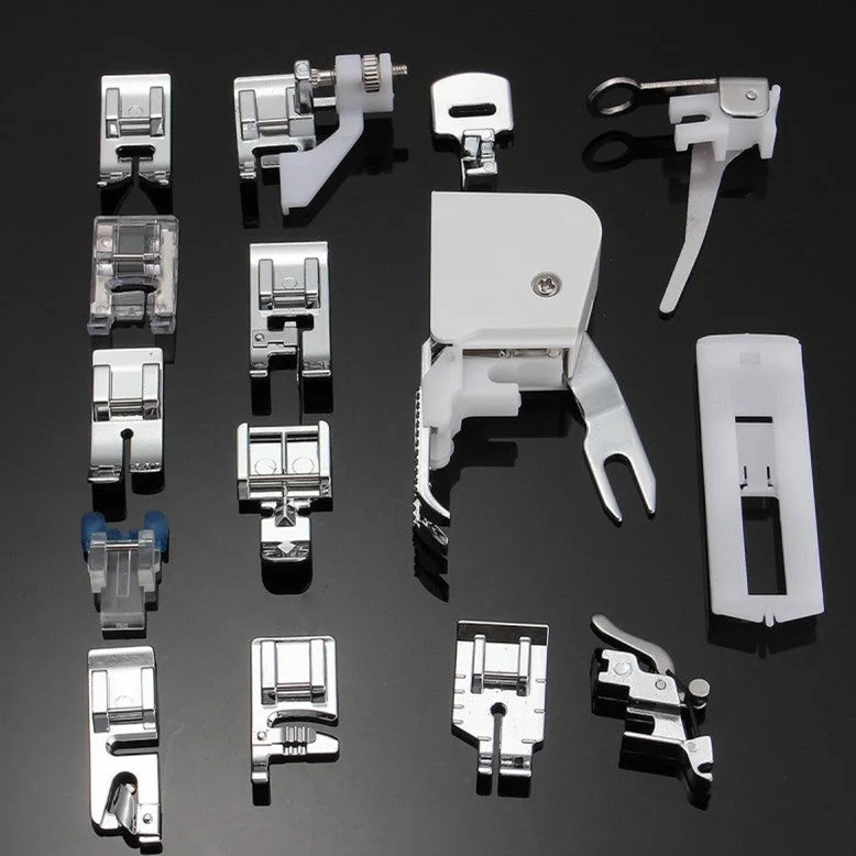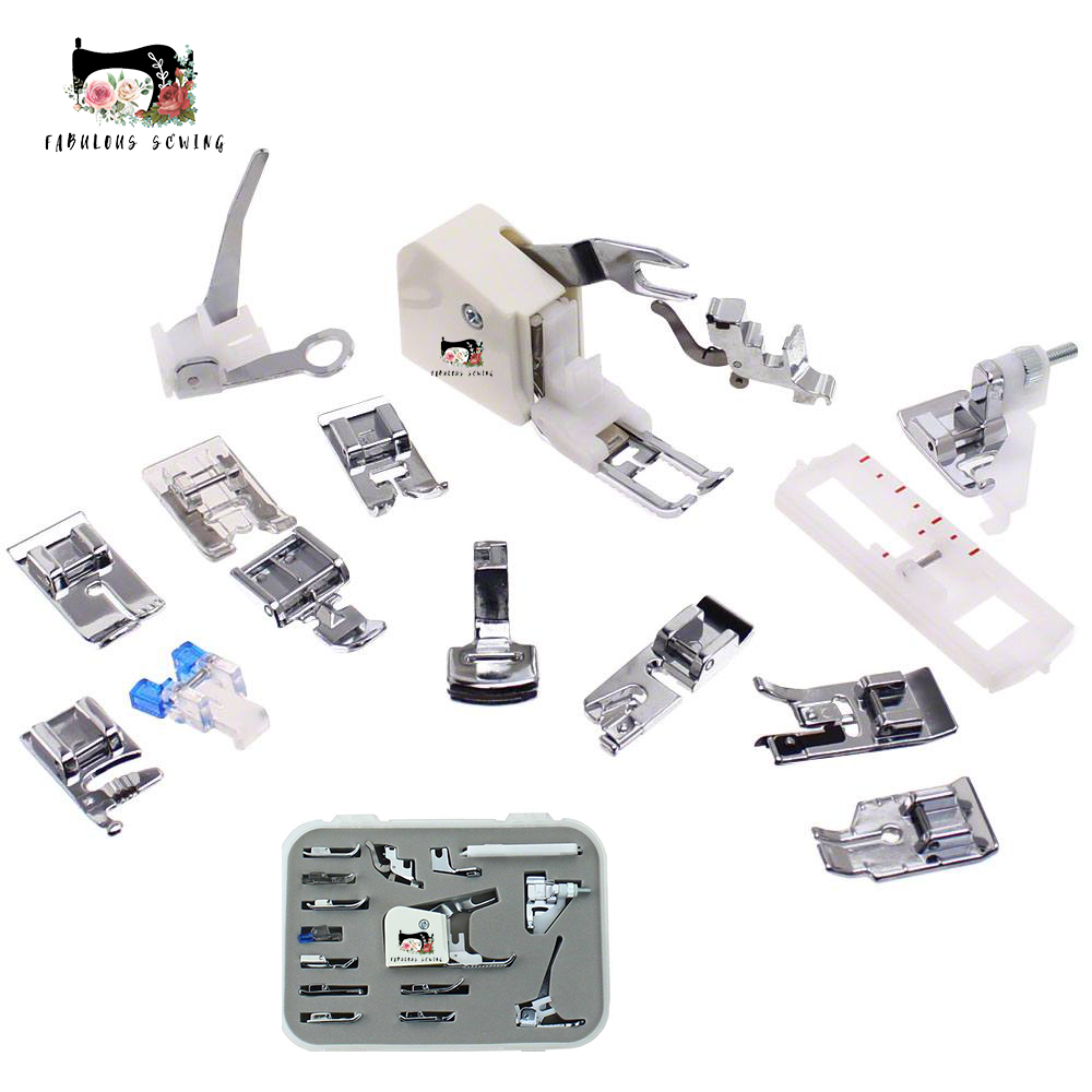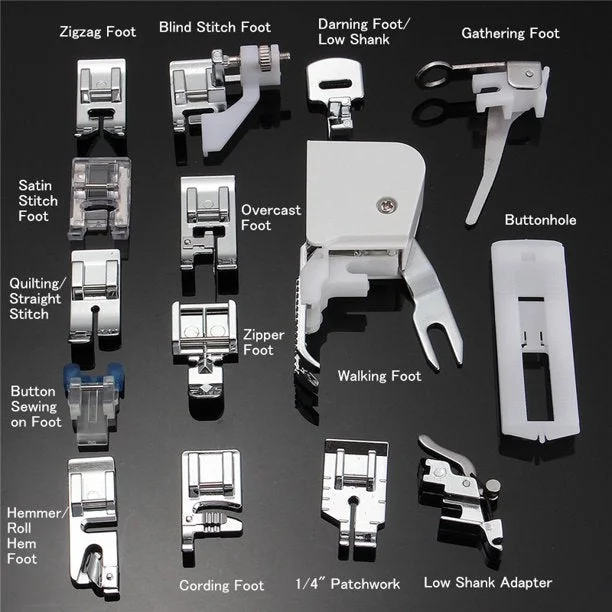 Package included - Low shank adapter for all purpose, foot, buttonhole satin, stitch foot, quilting, straight site, button sewing on foot, Zipper foot, hemmer roll hem foot ,blind stitch foot, cording foot, Overcast foot, 1/4 patchwork darning foot, Low shank gathering foot, Walking fot.