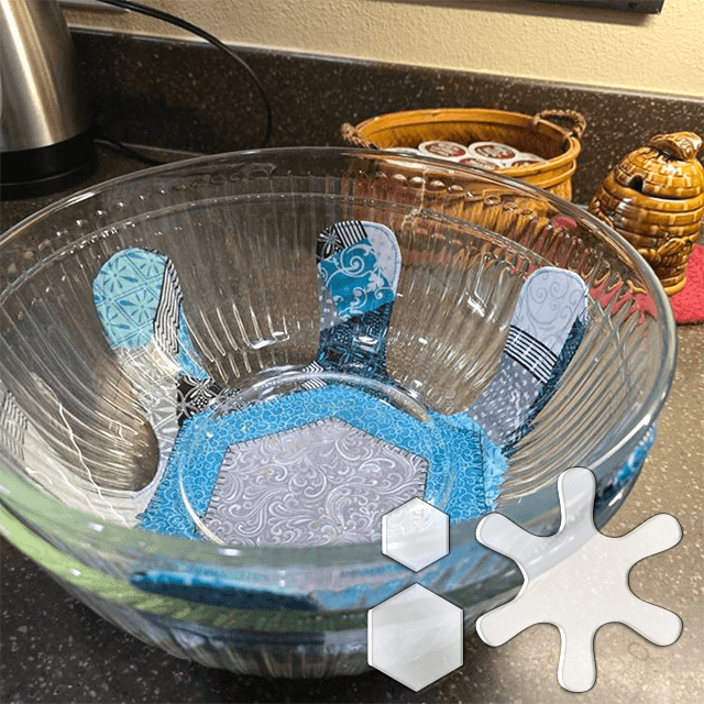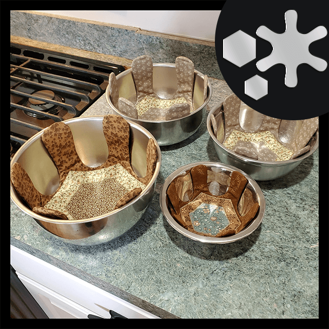 They whip up pretty darn fast and work well to keep down the scratches when you're stacking your pans, pots, and glass bowls. The fabric and batting provide a cushioned layer, and the pinked edges fluff up when washed. Works to help keep dishes from rattling in the camp trailer and motorhome, too.