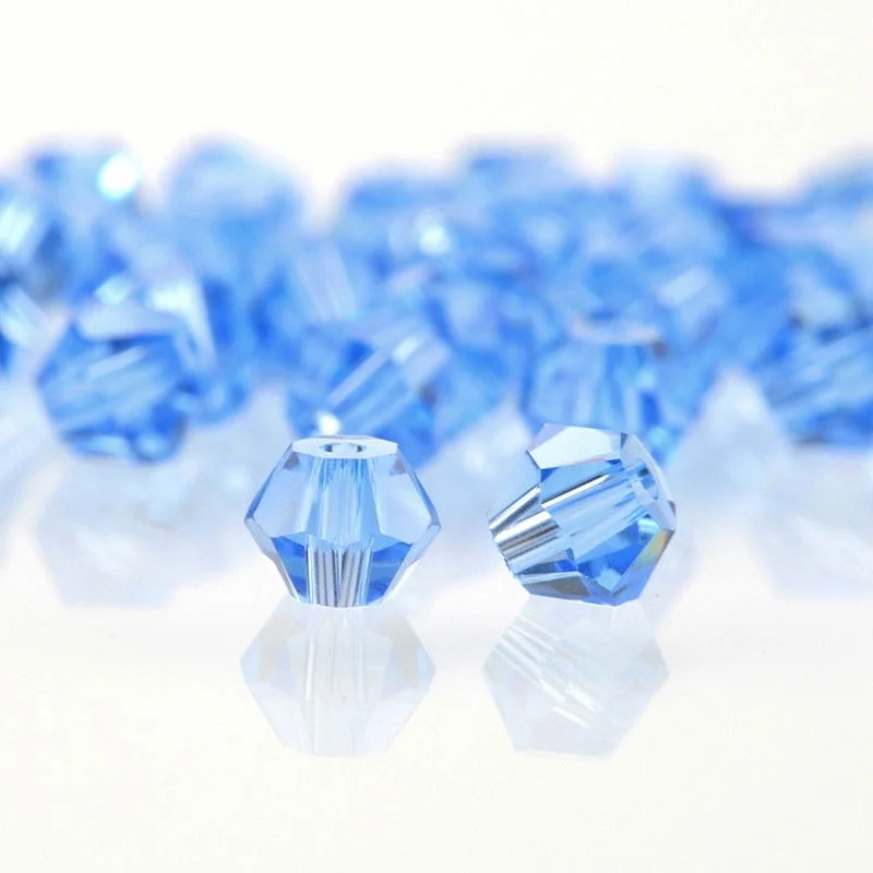 Crystals beads are made from artificial crystal craft which is cut to form multiple facets and designs. Bicone crystal beads are also called new cut beads. These crystal beads are fire-polished to give extra shine and without any sharp or pointed edges. The faces of the bead reflect a large amount of light which in turn creates a magical sparkling effect.