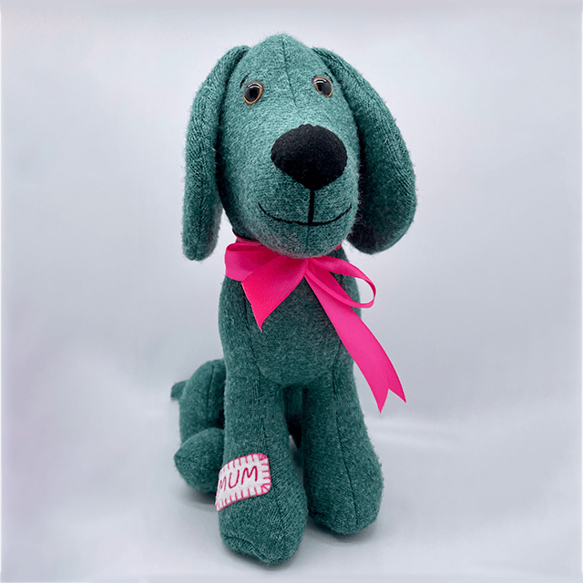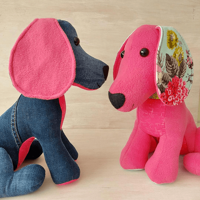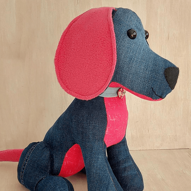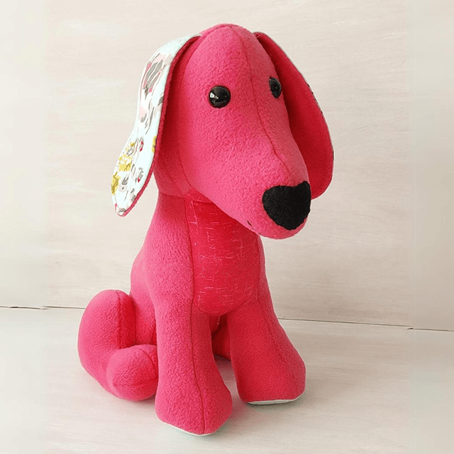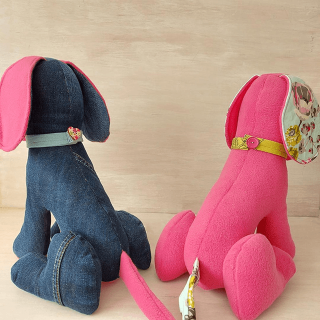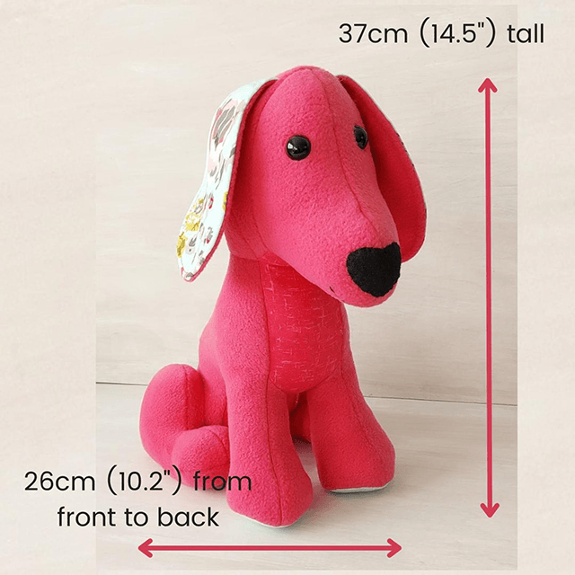 Darcy Dog has a happy face, with a lovely smile and big eyes, big floppy spaniel ears and a tail ready to wag. He is sitting up and has his back and front legs sewn on so there is no need to sew any complicated joins. If you are making him as a keepsake, the ears have plenty of room to embroider names and dates.
