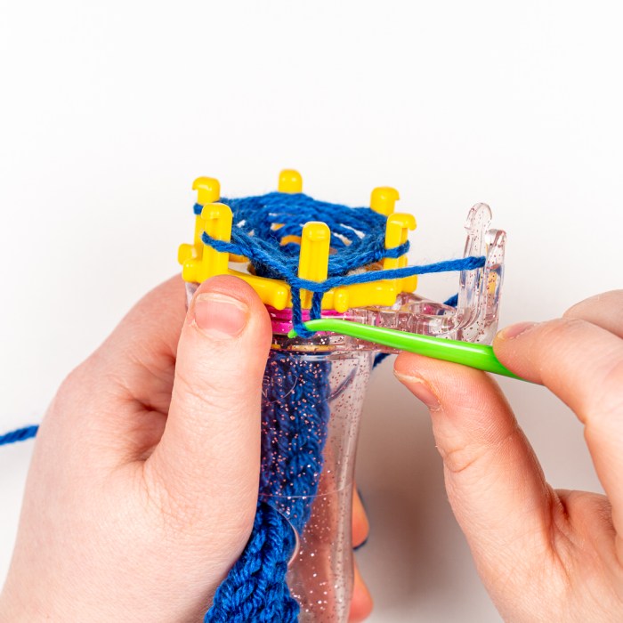 Cut your working yarn, leaving a tail of at least 5 – 6 inches (or longer depending on what you’ll be using your project for). With the working yarn placed over the yarn on the first pin (as if you are knitting it), place the tip of the loom tool under the yarn loop on the pin, from bottom to top and pull the working yarn under the loop on the pin. Repeat this with each pin around and then use the loom tool to remove your project from the loom. Alternatively, you can thread your tail onto a tapestry needle and weave the end under the loop on each pin before removing it from the loom. Pull on the end of your working yarn and cinch the top of your project closed.