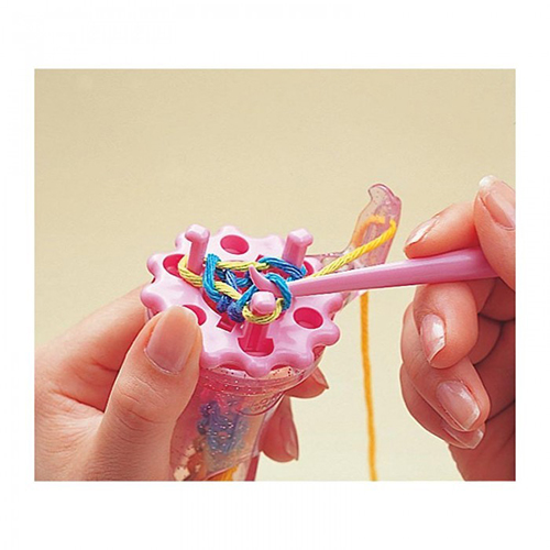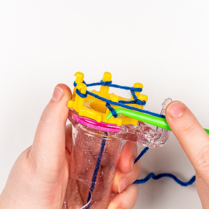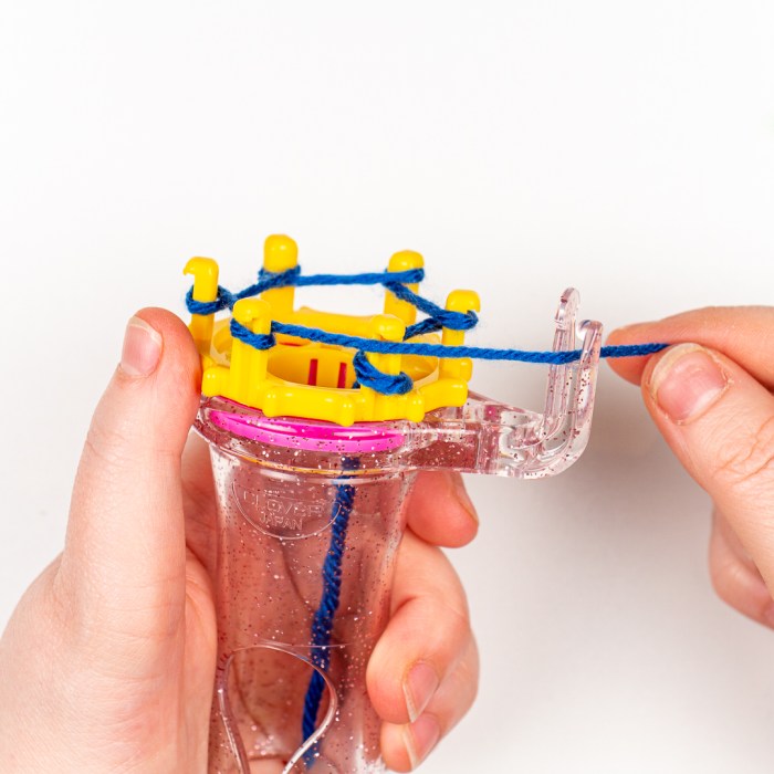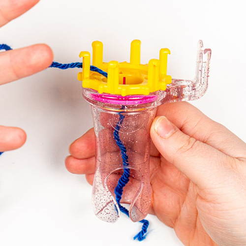 Step One: Place the end of your yarn through the center of the Wonder Knitter from the top and out through the bottom of the cylinder. You may find step two easier if you hold the end of the yarn with your pinky finger or between the cylinder and your hand that’s holding the Wonder Knitter.