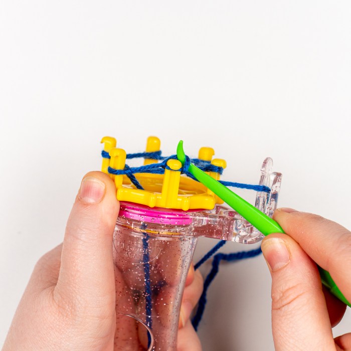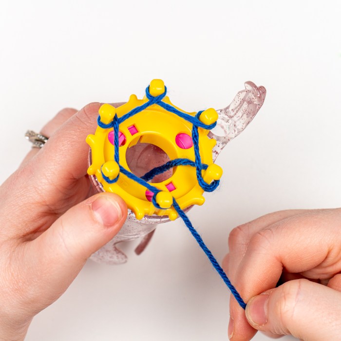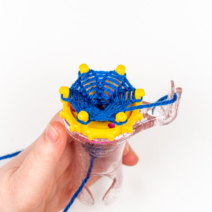 Step One: Use your thumb to turn the disc clockwise so that the working yarn is above the yarn that’s wrapped around the next pin.